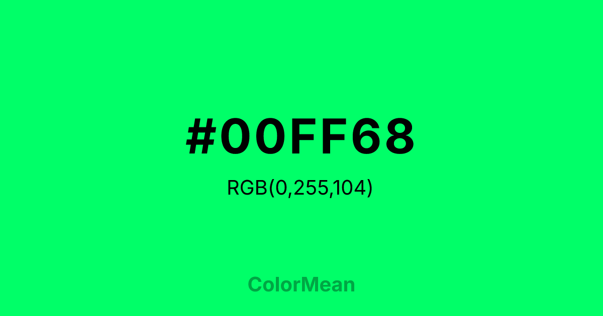 #00FF68 RGB value is (0, 255, 104). The hex color red value is 0, green is 255, and blue is 104. Its HSL format shows a hue of 144°, saturation of 100 percent, and lightness of 50 percent. The CMYK process values are 100 percent, 0 percent, 59 percent, 0 percent.