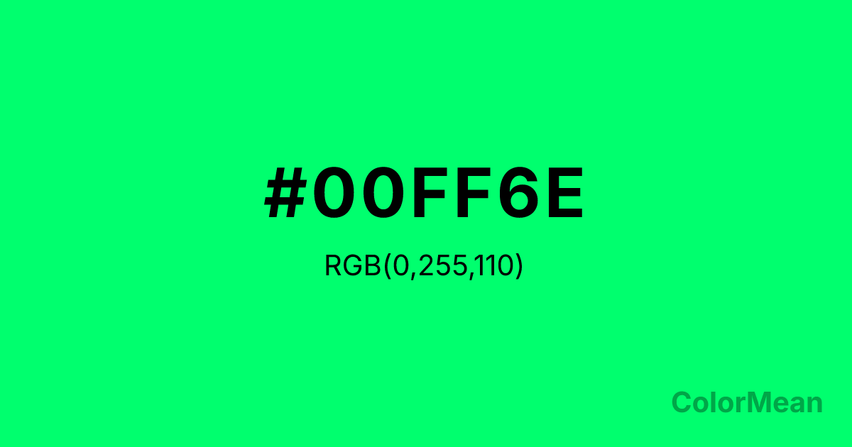 #00FF6E RGB value is (0, 255, 110). The hex color red value is 0, green is 255, and blue is 110. Its HSL format shows a hue of 146°, saturation of 100 percent, and lightness of 50 percent. The CMYK process values are 100 percent, 0 percent, 57 percent, 0 percent.