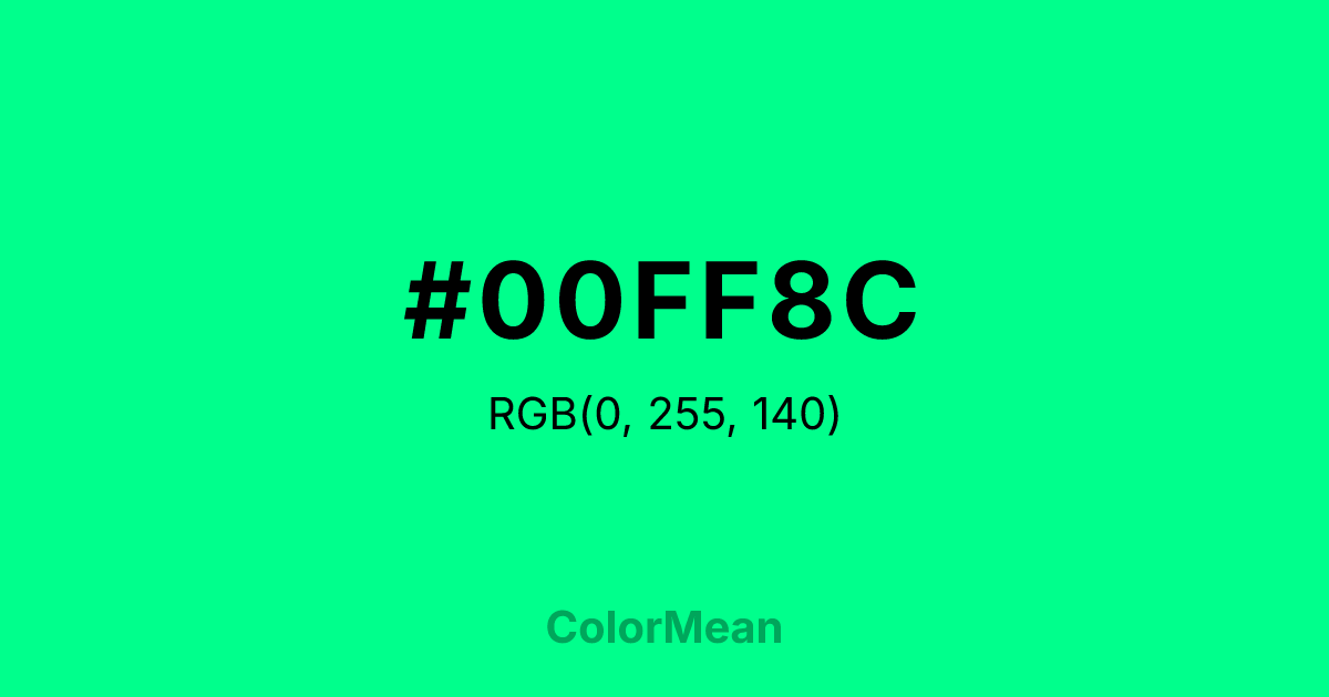 #00FF8C RGB value is (0, 255, 140). The hex color red value is 0, green is 255, and blue is 140. Its HSL format shows a hue of 153°, saturation of 100 percent, and lightness of 50 percent. The CMYK process values are 100 percent, 0 percent, 45 percent, 0 percent.