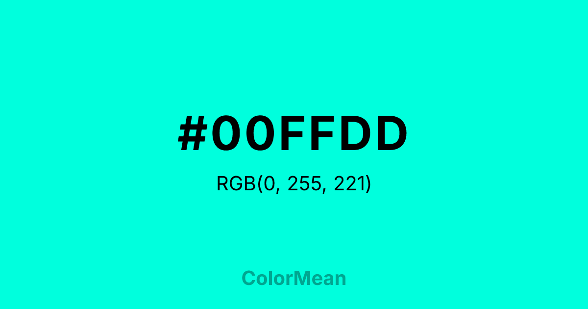 #00FFDD RGB value is (0, 255, 221). The hex color red value is 0, green is 255, and blue is 221. Its HSL format shows a hue of 172°, saturation of 100 percent, and lightness of 50 percent. The CMYK process values are 100 percent, 0 percent, 13 percent, 0 percent.