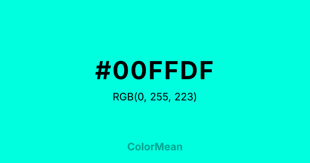 #00FFDF RGB value is (0, 255, 223). The hex color red value is 0, green is 255, and blue is 223. Its HSL format shows a hue of 172°, saturation of 100 percent, and lightness of 50 percent. The CMYK process values are 100 percent, 0 percent, 13 percent, 0 percent.