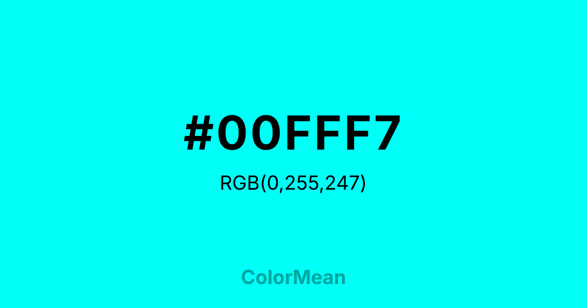 #00FFF7 RGB value is (0, 255, 247). The hex color red value is 0, green is 255, and blue is 247. Its HSL format shows a hue of 178°, saturation of 100 percent, and lightness of 50 percent. The CMYK process values are 100 percent, 0 percent, 3 percent, 0 percent.