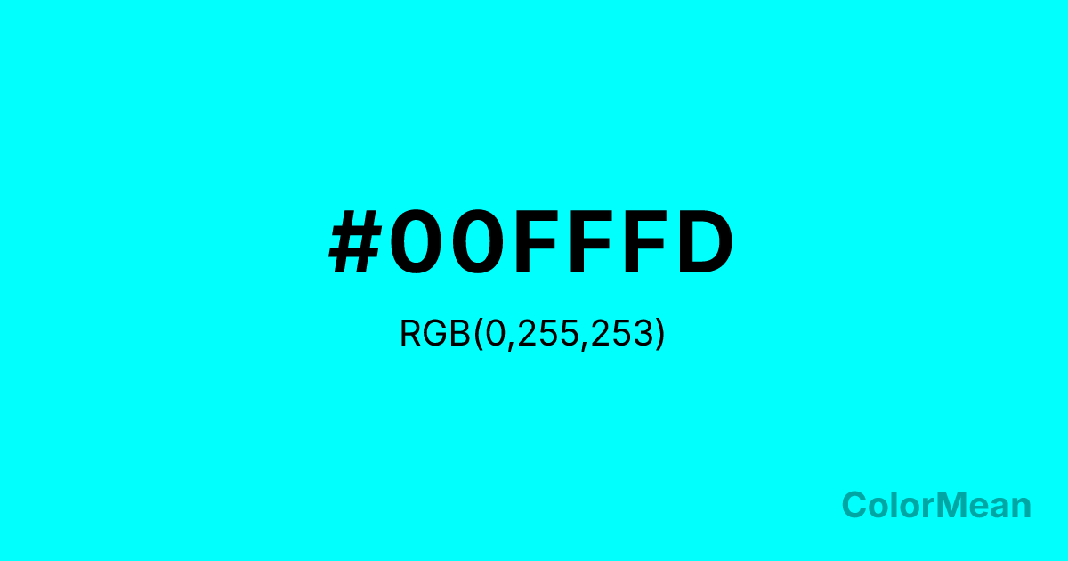 #00FFFD RGB value is (0, 255, 253). The hex color red value is 0, green is 255, and blue is 253. Its HSL format shows a hue of 180°, saturation of 100 percent, and lightness of 50 percent. The CMYK process values are 100 percent, 0 percent, 1 percent, 0 percent.