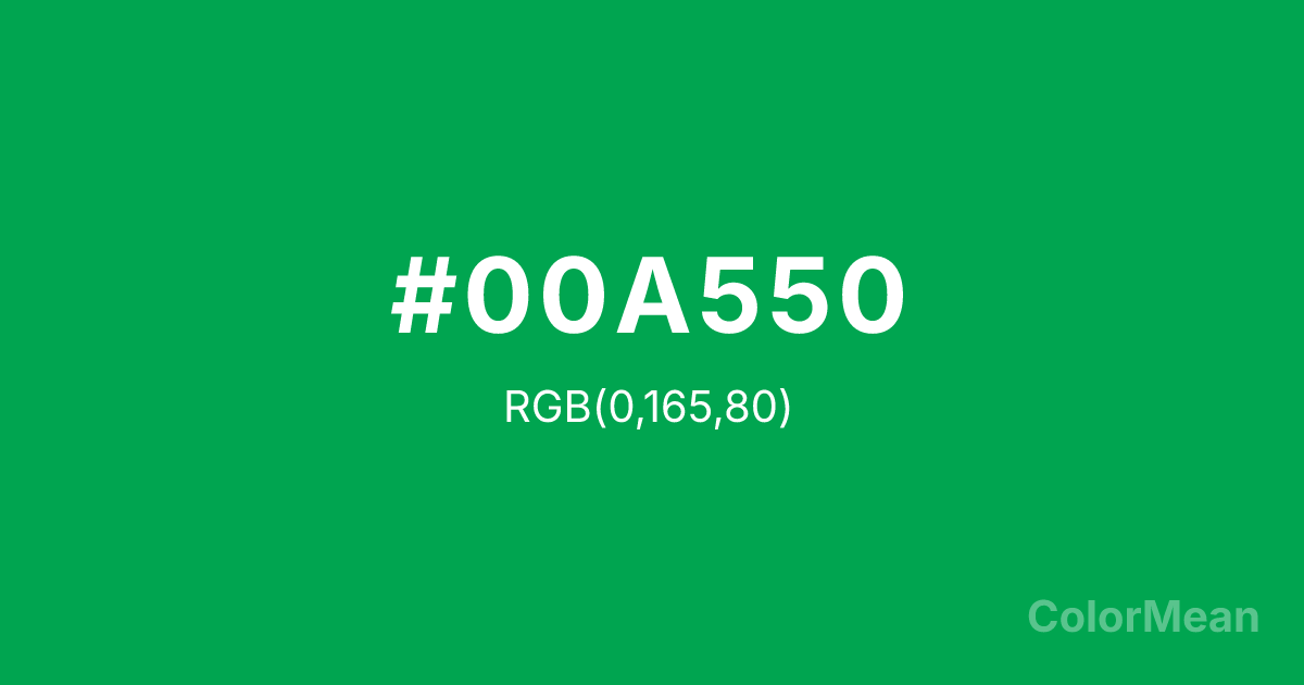 Green Pigment (#00A550) RGB value is (0, 165, 80). The hex color red value is 0, green is 165, and blue is 80. Its HSL format shows a hue of 149°, saturation of 100 percent, and lightness of 32 percent. The CMYK process values are 100 percent, 0 percent, 52 percent, 35 percent.