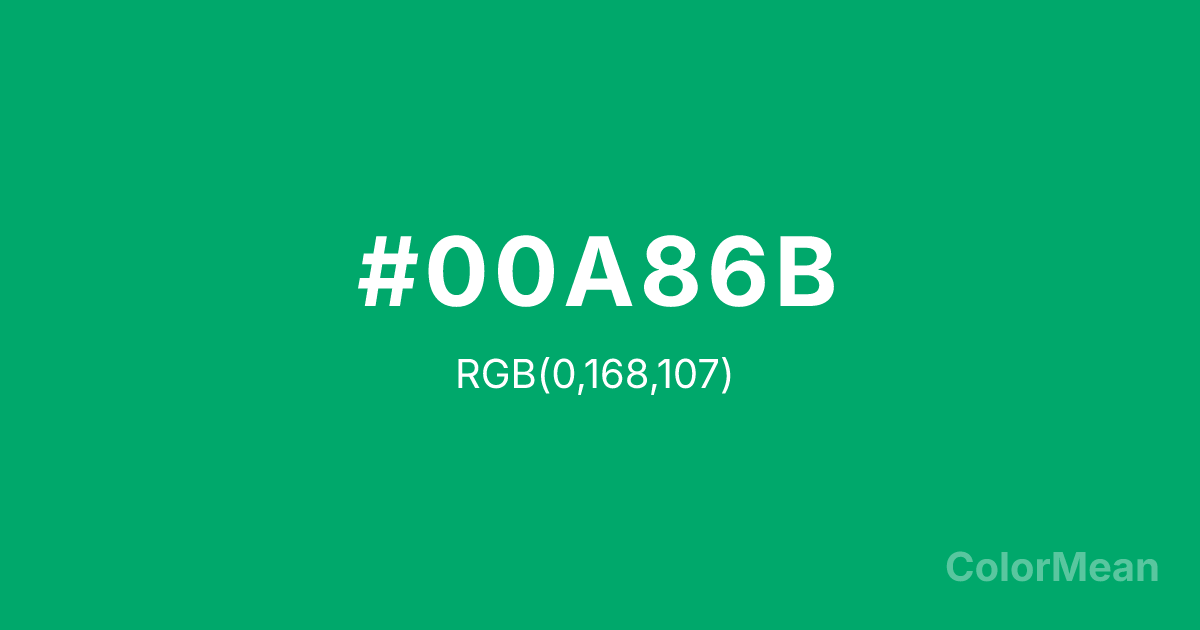 Jade (#00A86B) RGB value is (0, 168, 107). The hex color red value is 0, green is 168, and blue is 107. Its HSL format shows a hue of 158°, saturation of 100 percent, and lightness of 33 percent. The CMYK process values are 100 percent, 0 percent, 36 percent, 34 percent.