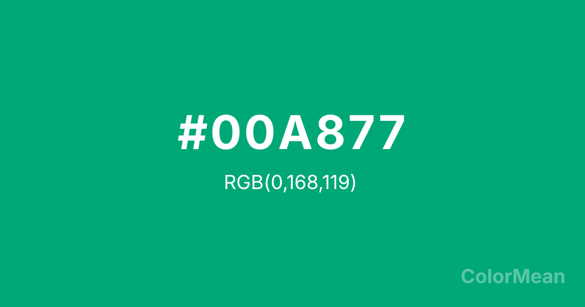 Green Munsell (#00A877) RGB value is (0, 168, 119). The hex color red value is 0, green is 168, and blue is 119. Its HSL format shows a hue of 163°, saturation of 100 percent, and lightness of 33 percent. The CMYK process values are 100 percent, 0 percent, 29 percent, 34 percent.