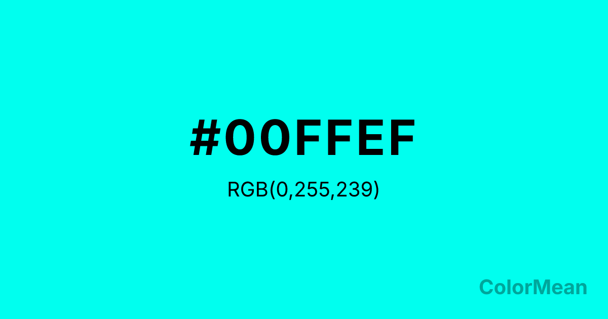 Turquoise Blue (#00FFEF) RGB value is (0, 255, 239). The hex color red value is 0, green is 255, and blue is 239. Its HSL format shows a hue of 176°, saturation of 100 percent, and lightness of 50 percent. The CMYK process values are 100 percent, 0 percent, 6 percent, 0 percent.