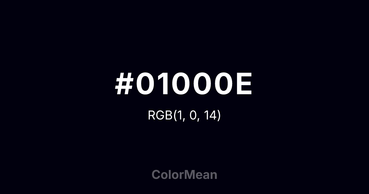 #01000E RGB value is (1, 0, 14). The hex color red value is 1, green is 0, and blue is 14. Its HSL format shows a hue of 244°, saturation of 100 percent, and lightness of 3 percent. The CMYK process values are 93 percent, 100 percent, 0 percent, 95 percent.