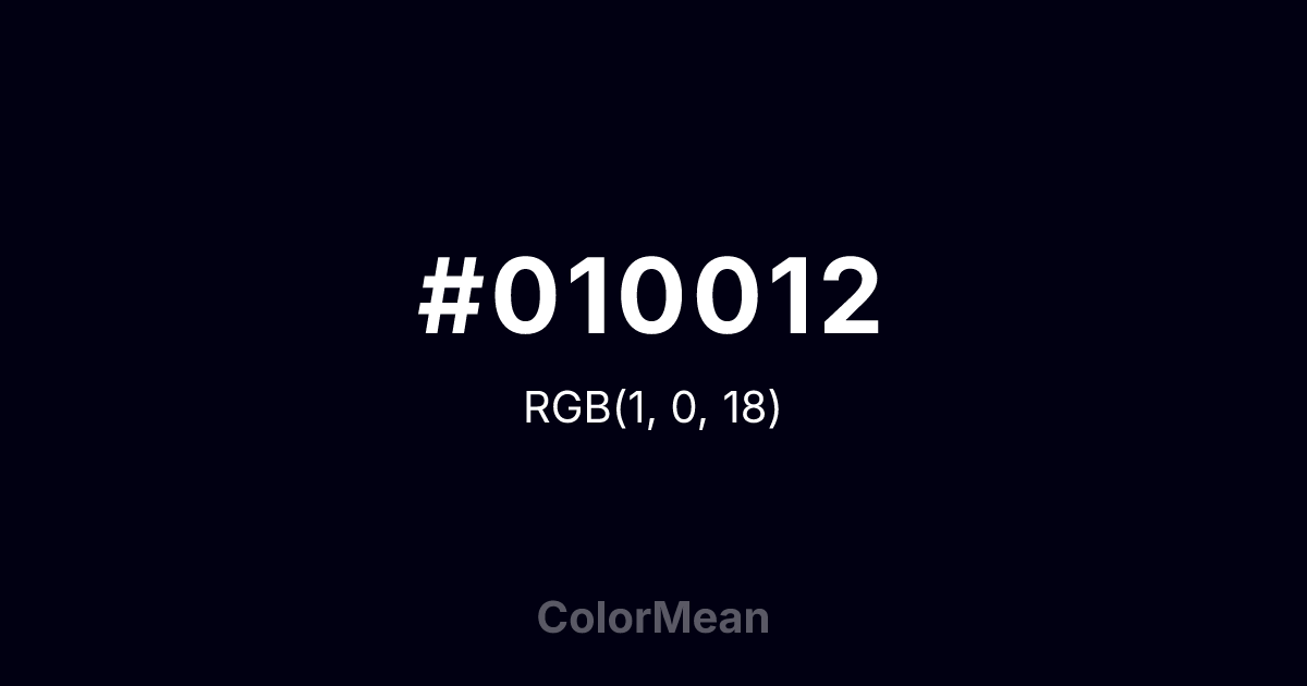 #010012 RGB value is (1, 0, 18). The hex color red value is 1, green is 0, and blue is 18. Its HSL format shows a hue of 243°, saturation of 100 percent, and lightness of 4 percent. The CMYK process values are 94 percent, 100 percent, 0 percent, 93 percent.