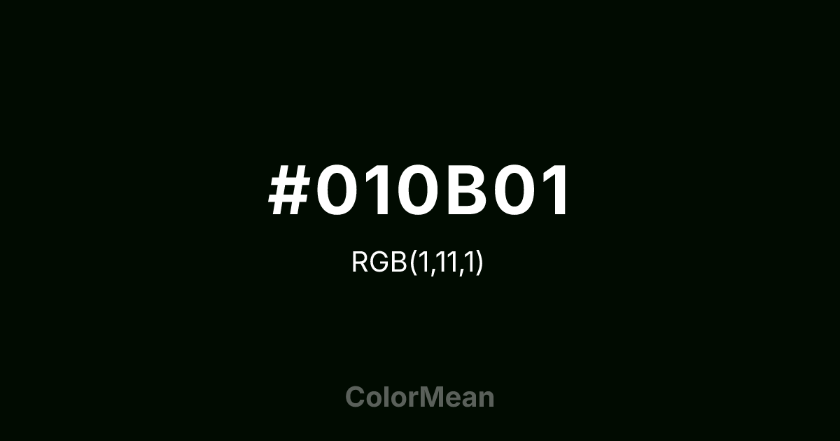 #010B01 RGB value is (1, 11, 1). The hex color red value is 1, green is 11, and blue is 1. Its HSL format shows a hue of 120°, saturation of 83 percent, and lightness of 2 percent. The CMYK process values are 91 percent, 0 percent, 91 percent, 96 percent.