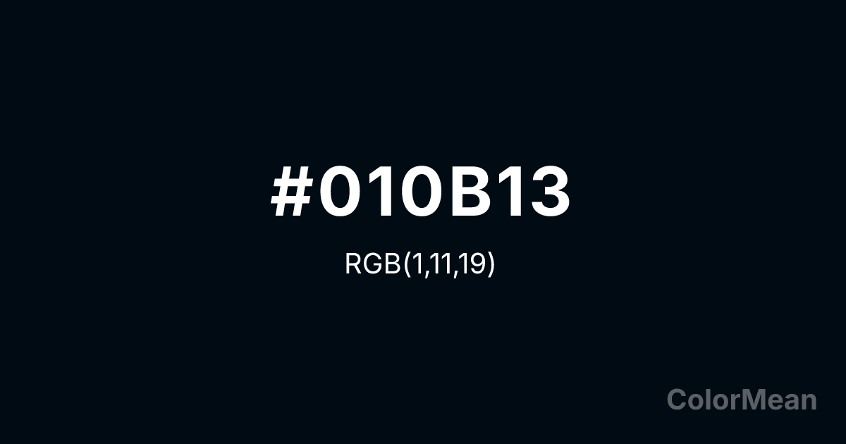 Rich Black (FOGRA29) (#010B13) RGB value is (1, 11, 19). The hex color red value is 1, green is 11, and blue is 19. Its HSL format shows a hue of 207°, saturation of 90 percent, and lightness of 4 percent. The CMYK process values are 95 percent, 42 percent, 0 percent, 93 percent.