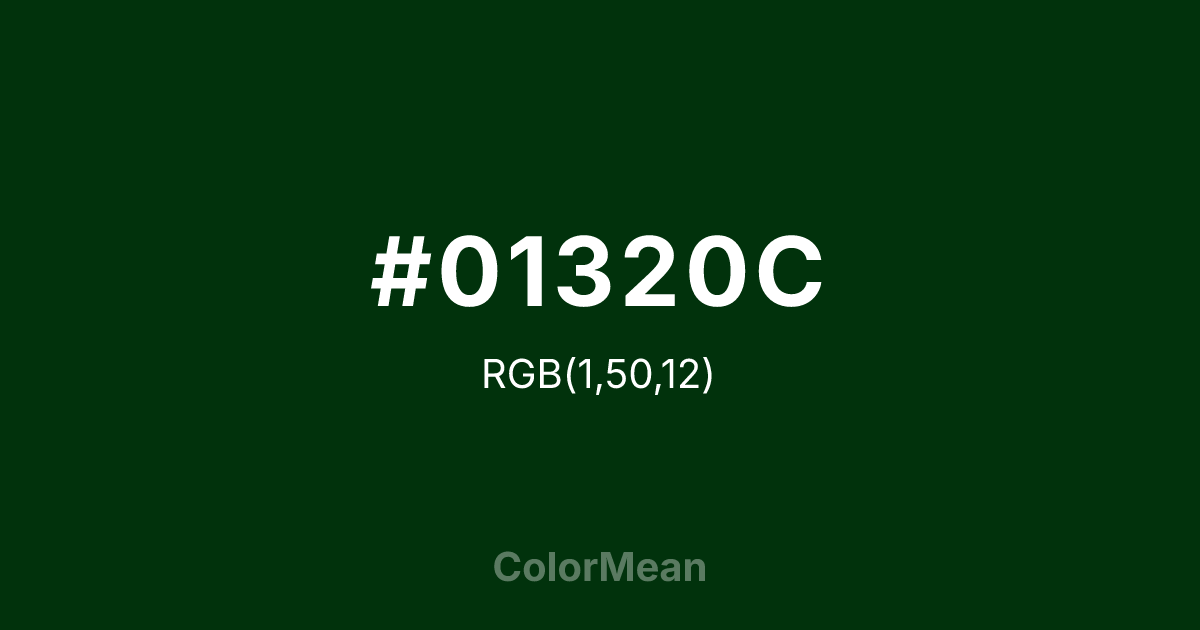 #01320C RGB value is (1, 50, 12). The hex color red value is 1, green is 50, and blue is 12. Its HSL format shows a hue of 133°, saturation of 96 percent, and lightness of 10 percent. The CMYK process values are 98 percent, 0 percent, 76 percent, 80 percent.