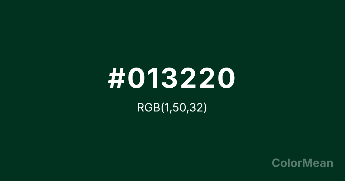 Dark Green (#013220) RGB value is (1, 50, 32). The hex color red value is 1, green is 50, and blue is 32. Its HSL format shows a hue of 158°, saturation of 96 percent, and lightness of 10 percent. The CMYK process values are 98 percent, 0 percent, 36 percent, 80 percent.