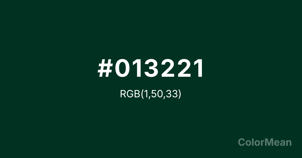 #013221 RGB value is (1, 50, 33). The hex color red value is 1, green is 50, and blue is 33. Its HSL format shows a hue of 159°, saturation of 96 percent, and lightness of 10 percent. The CMYK process values are 98 percent, 0 percent, 34 percent, 80 percent.