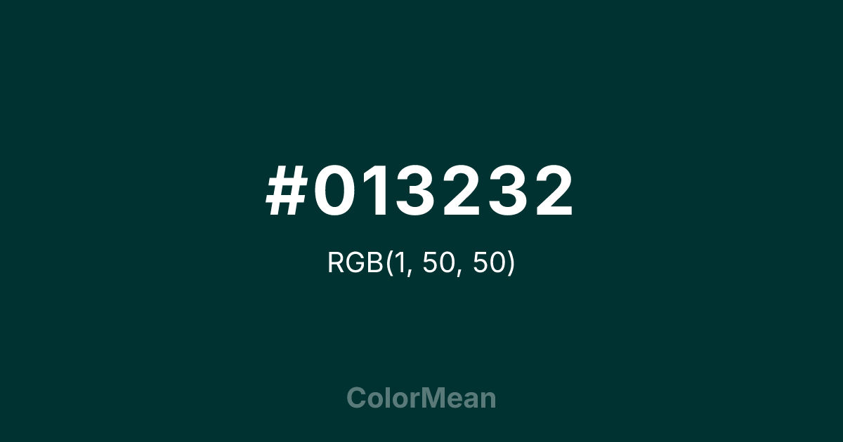 #013232 RGB value is (1, 50, 50). The hex color red value is 1, green is 50, and blue is 50. Its HSL format shows a hue of 180°, saturation of 96 percent, and lightness of 10 percent. The CMYK process values are 98 percent, 0 percent, 0 percent, 80 percent.