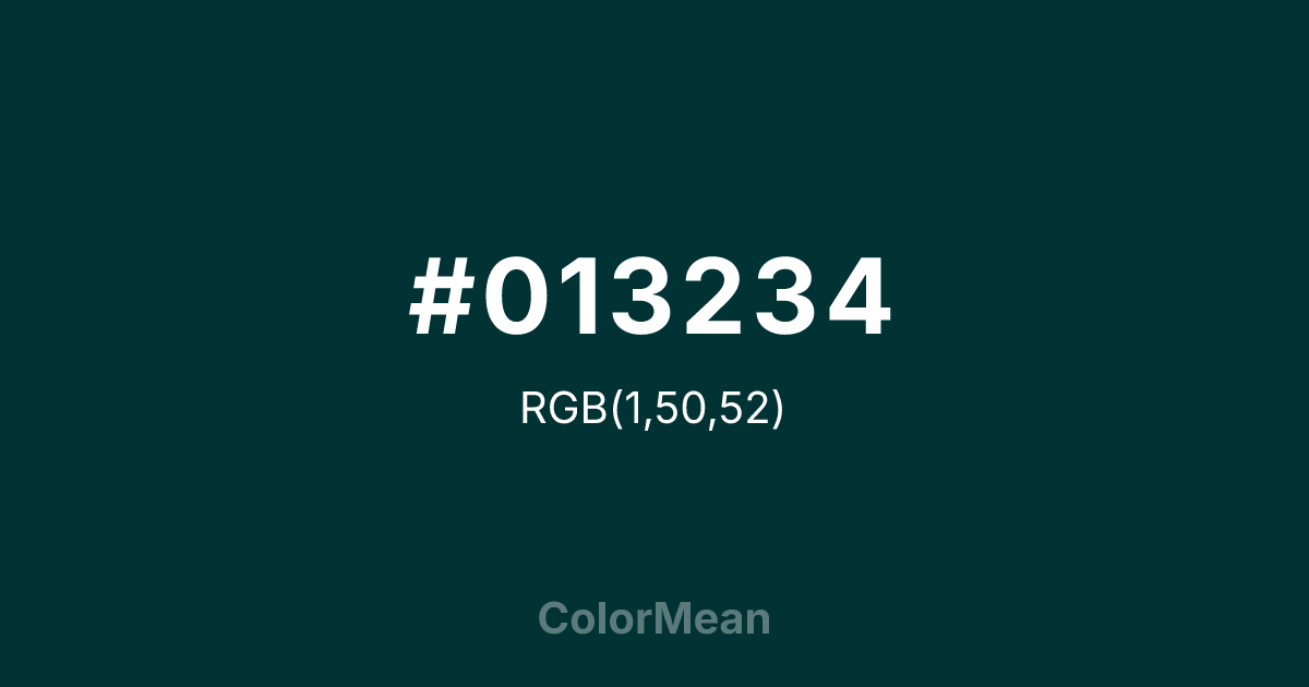 #013234 RGB value is (1, 50, 52). The hex color red value is 1, green is 50, and blue is 52. Its HSL format shows a hue of 182°, saturation of 96 percent, and lightness of 10 percent. The CMYK process values are 98 percent, 4 percent, 0 percent, 80 percent.