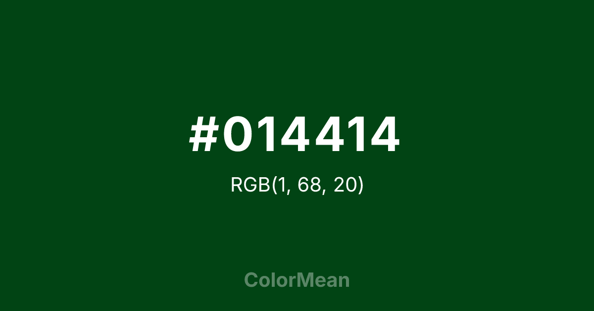 #014414 RGB value is (1, 68, 20). The hex color red value is 1, green is 68, and blue is 20. Its HSL format shows a hue of 137°, saturation of 97 percent, and lightness of 14 percent. The CMYK process values are 99 percent, 0 percent, 71 percent, 73 percent.