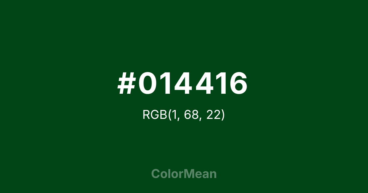 #014416 RGB value is (1, 68, 22). The hex color red value is 1, green is 68, and blue is 22. Its HSL format shows a hue of 139°, saturation of 97 percent, and lightness of 14 percent. The CMYK process values are 99 percent, 0 percent, 68 percent, 73 percent.
