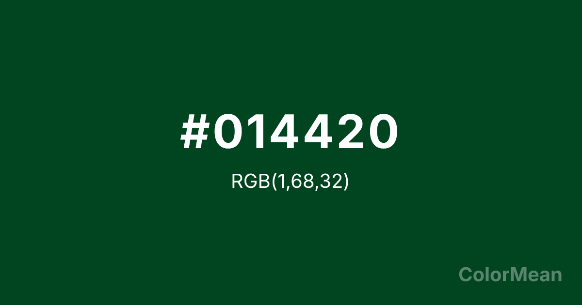#014420 RGB value is (1, 68, 32). The hex color red value is 1, green is 68, and blue is 32. Its HSL format shows a hue of 148°, saturation of 97 percent, and lightness of 14 percent. The CMYK process values are 99 percent, 0 percent, 53 percent, 73 percent.