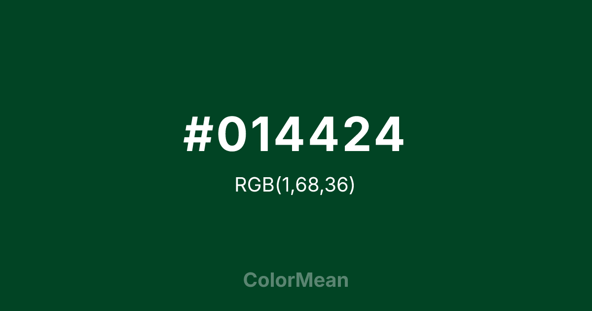 #014424 RGB value is (1, 68, 36). The hex color red value is 1, green is 68, and blue is 36. Its HSL format shows a hue of 151°, saturation of 97 percent, and lightness of 14 percent. The CMYK process values are 99 percent, 0 percent, 47 percent, 73 percent.