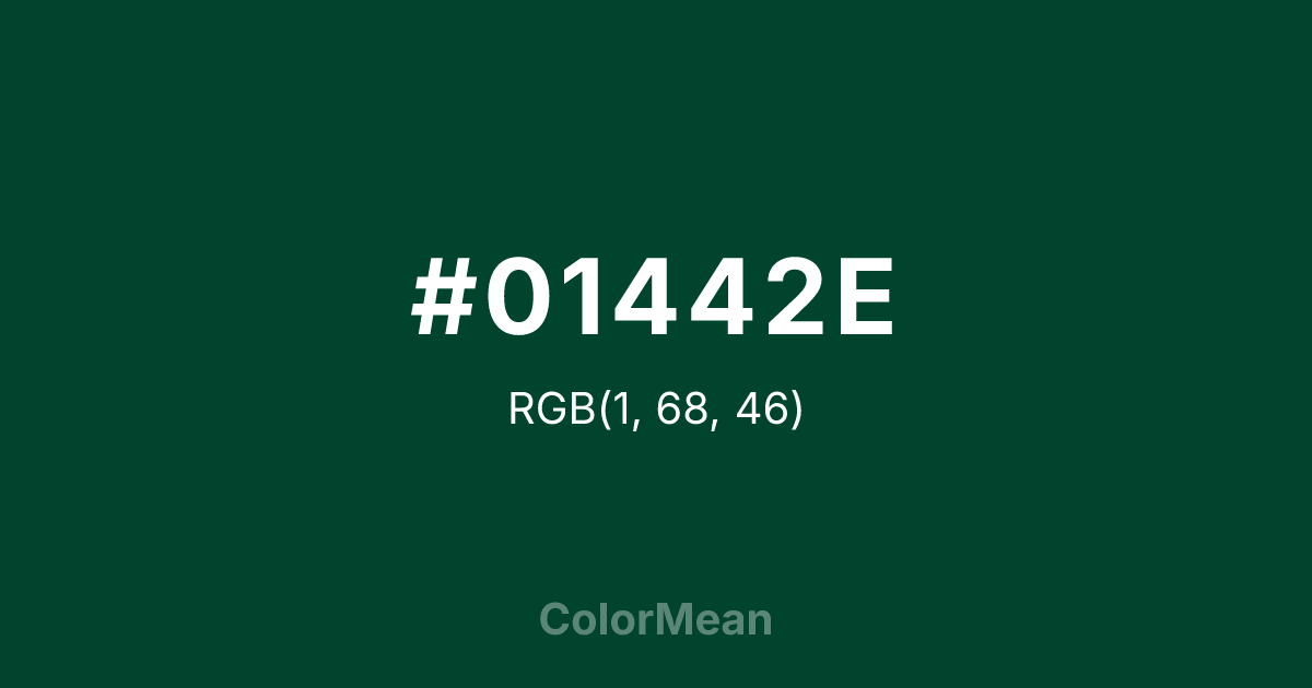 #01442E RGB value is (1, 68, 46). The hex color red value is 1, green is 68, and blue is 46. Its HSL format shows a hue of 160°, saturation of 97 percent, and lightness of 14 percent. The CMYK process values are 99 percent, 0 percent, 32 percent, 73 percent.