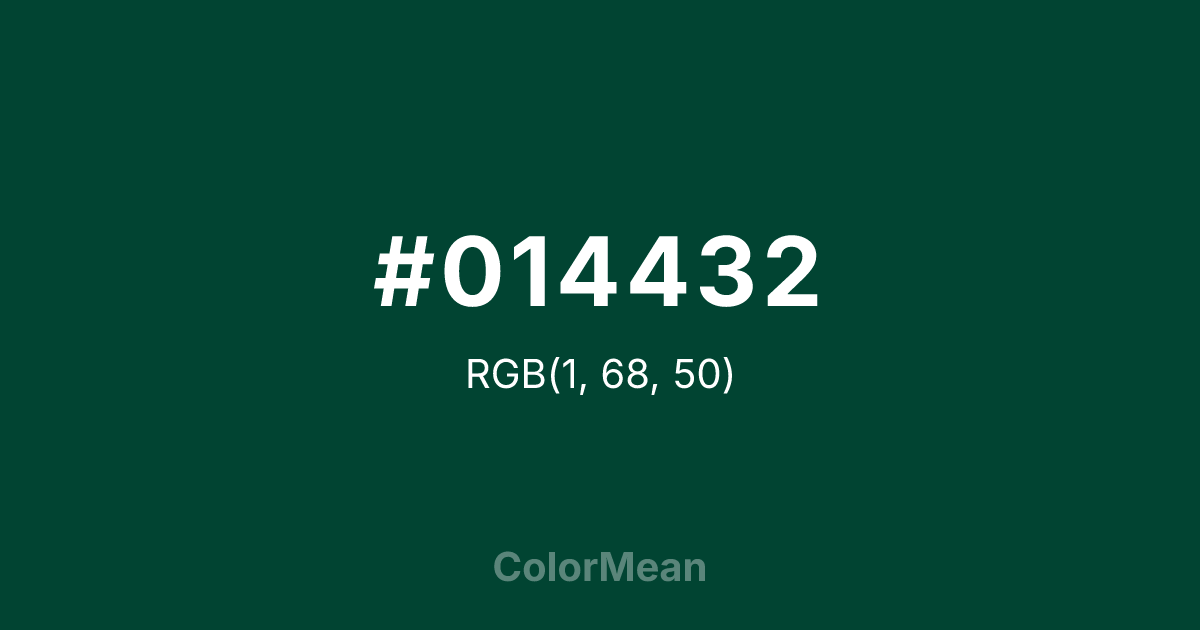 #014432 RGB value is (1, 68, 50). The hex color red value is 1, green is 68, and blue is 50. Its HSL format shows a hue of 164°, saturation of 97 percent, and lightness of 14 percent. The CMYK process values are 99 percent, 0 percent, 26 percent, 73 percent.