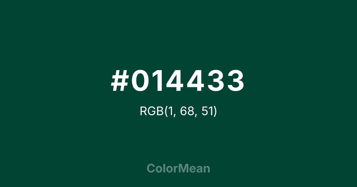 #014433 RGB value is (1, 68, 51). The hex color red value is 1, green is 68, and blue is 51. Its HSL format shows a hue of 165°, saturation of 97 percent, and lightness of 14 percent. The CMYK process values are 99 percent, 0 percent, 25 percent, 73 percent.