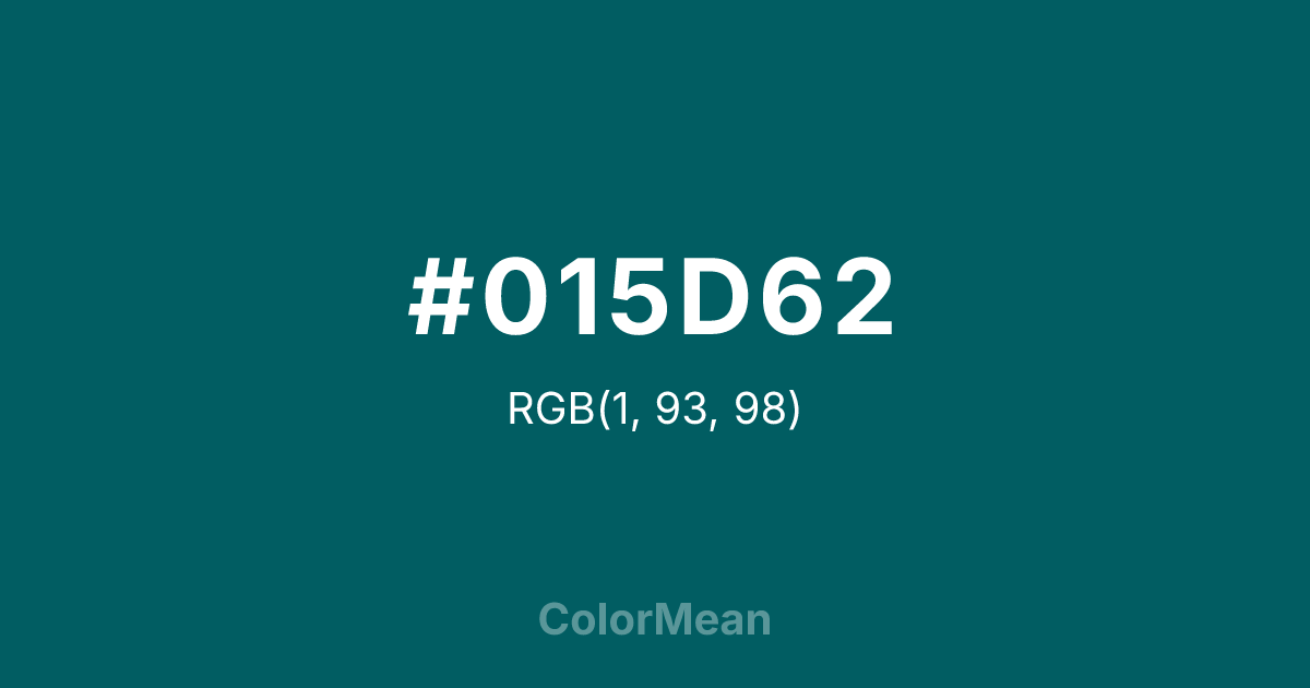 #015D62 RGB value is (1, 93, 98). The hex color red value is 1, green is 93, and blue is 98. Its HSL format shows a hue of 183°, saturation of 98 percent, and lightness of 19 percent. The CMYK process values are 99 percent, 5 percent, 0 percent, 62 percent.