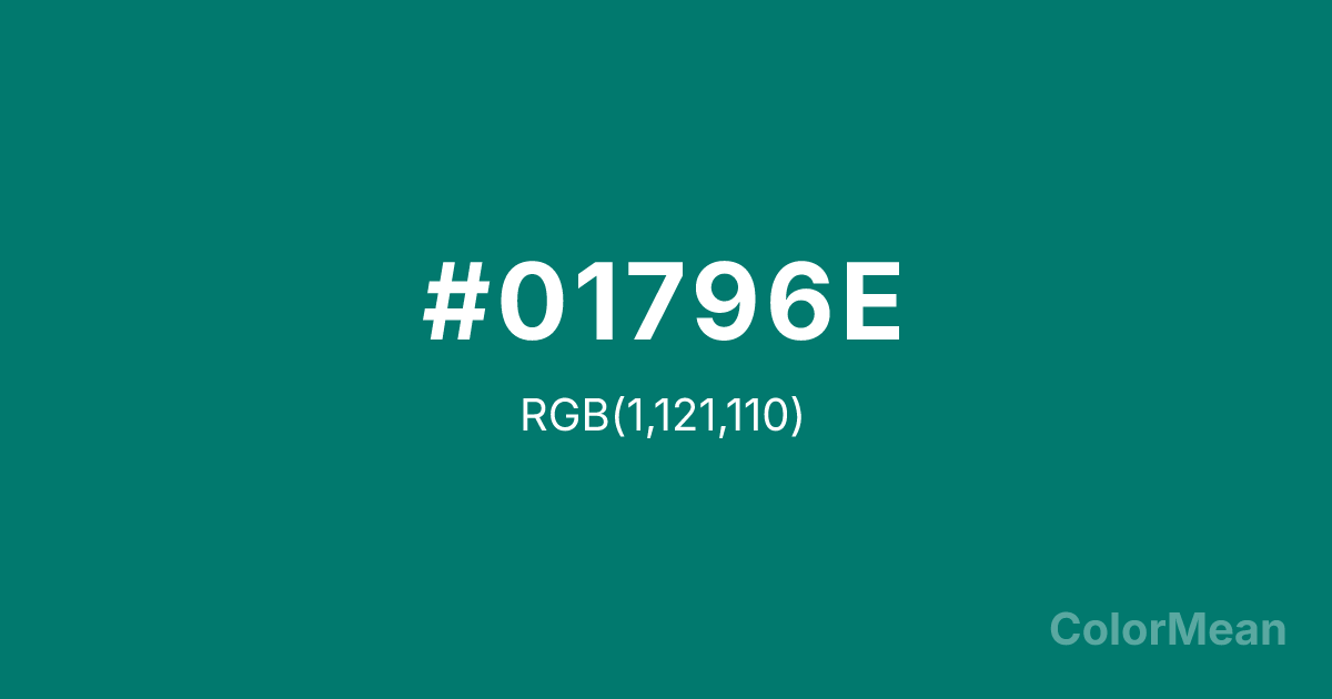 #01796E RGB value is (1, 121, 110). The hex color red value is 1, green is 121, and blue is 110. Its HSL format shows a hue of 175°, saturation of 98 percent, and lightness of 24 percent. The CMYK process values are 99 percent, 0 percent, 9 percent, 53 percent.