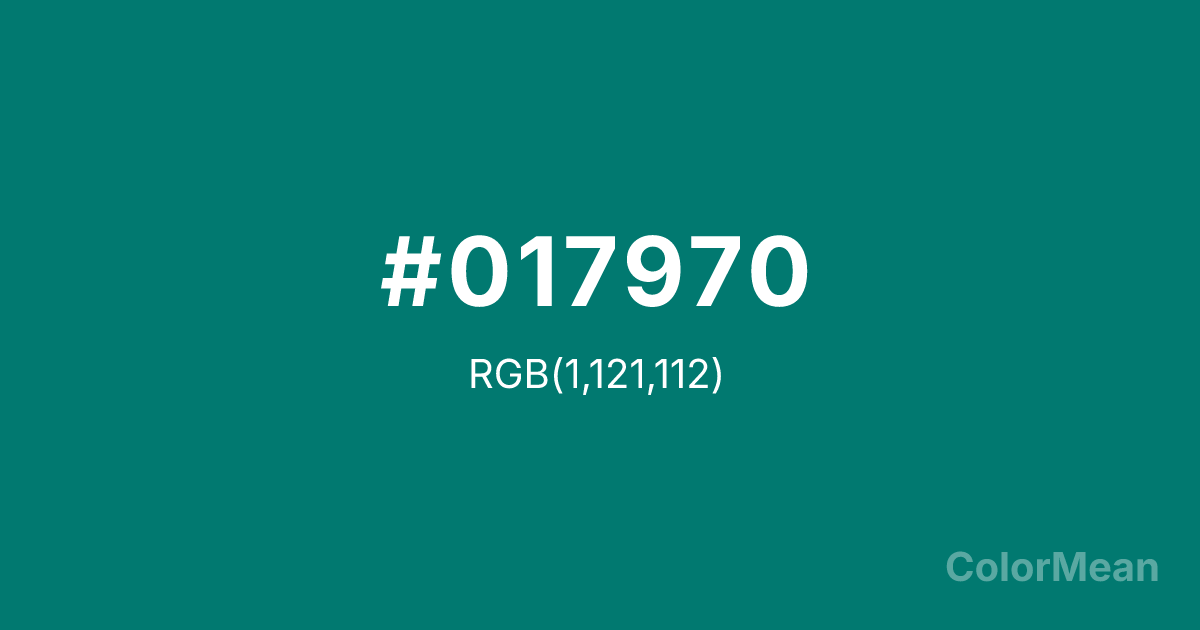 #017970 RGB value is (1, 121, 112). The hex color red value is 1, green is 121, and blue is 112. Its HSL format shows a hue of 176°, saturation of 98 percent, and lightness of 24 percent. The CMYK process values are 99 percent, 0 percent, 7 percent, 53 percent.