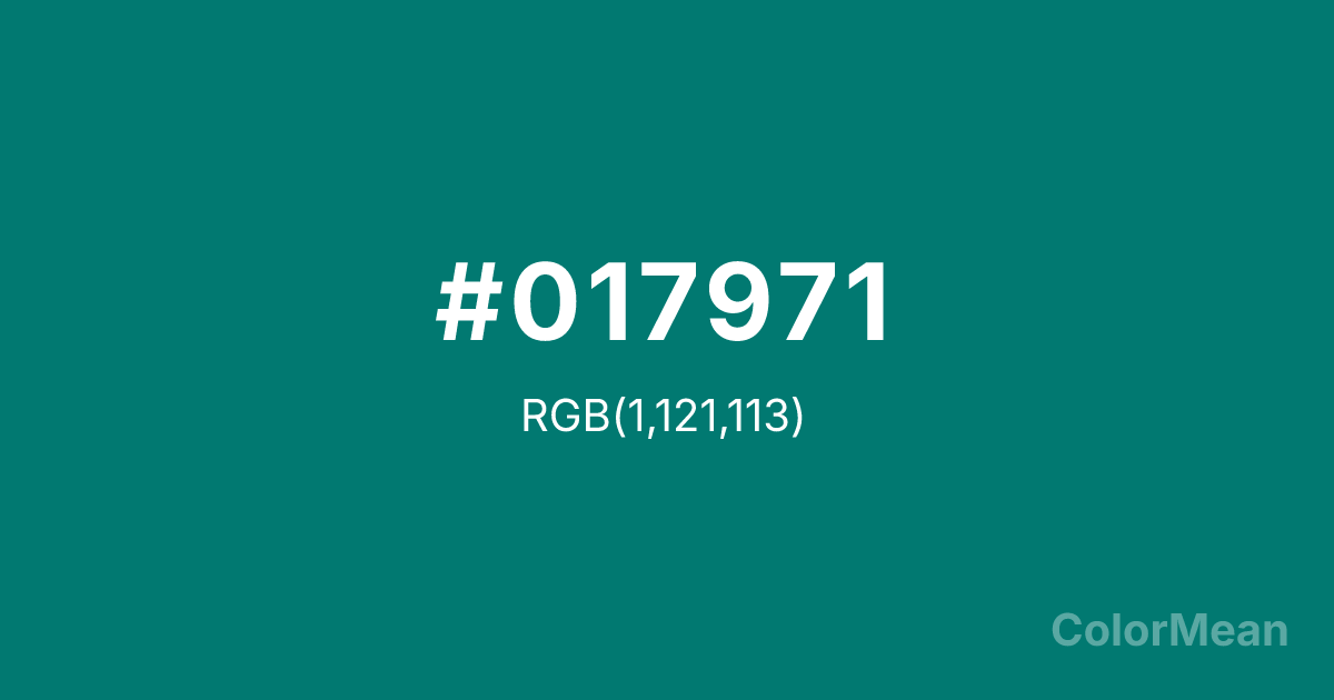 #017971 RGB value is (1, 121, 113). The hex color red value is 1, green is 121, and blue is 113. Its HSL format shows a hue of 176°, saturation of 98 percent, and lightness of 24 percent. The CMYK process values are 99 percent, 0 percent, 7 percent, 53 percent.