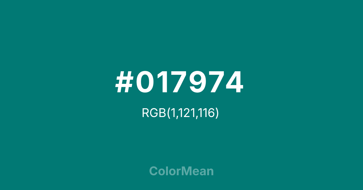 #017974 RGB value is (1, 121, 116). The hex color red value is 1, green is 121, and blue is 116. Its HSL format shows a hue of 178°, saturation of 98 percent, and lightness of 24 percent. The CMYK process values are 99 percent, 0 percent, 4 percent, 53 percent.