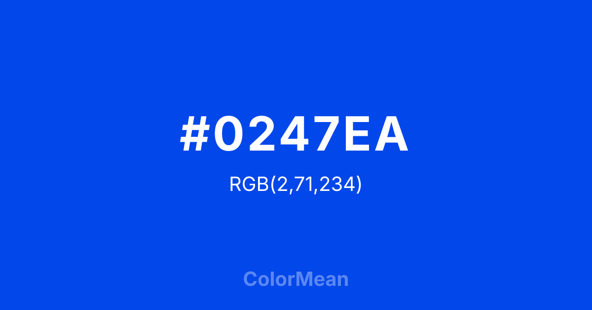 #0247EA RGB value is (2, 71, 234). The hex color red value is 2, green is 71, and blue is 234. Its HSL format shows a hue of 222°, saturation of 98 percent, and lightness of 46 percent. The CMYK process values are 99 percent, 70 percent, 0 percent, 8 percent.