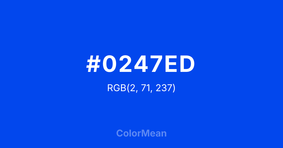 #0247ED RGB value is (2, 71, 237). The hex color red value is 2, green is 71, and blue is 237. Its HSL format shows a hue of 222°, saturation of 98 percent, and lightness of 47 percent. The CMYK process values are 99 percent, 70 percent, 0 percent, 7 percent.