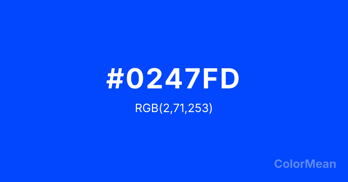 #0247FD RGB value is (2, 71, 253). The hex color red value is 2, green is 71, and blue is 253. Its HSL format shows a hue of 224°, saturation of 98 percent, and lightness of 50 percent. The CMYK process values are 99 percent, 72 percent, 0 percent, 1 percent.