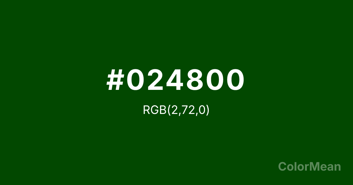#024800 RGB value is (2, 72, 0). The hex color red value is 2, green is 72, and blue is 0. Its HSL format shows a hue of 118°, saturation of 100 percent, and lightness of 14 percent. The CMYK process values are 97 percent, 0 percent, 100 percent, 72 percent.