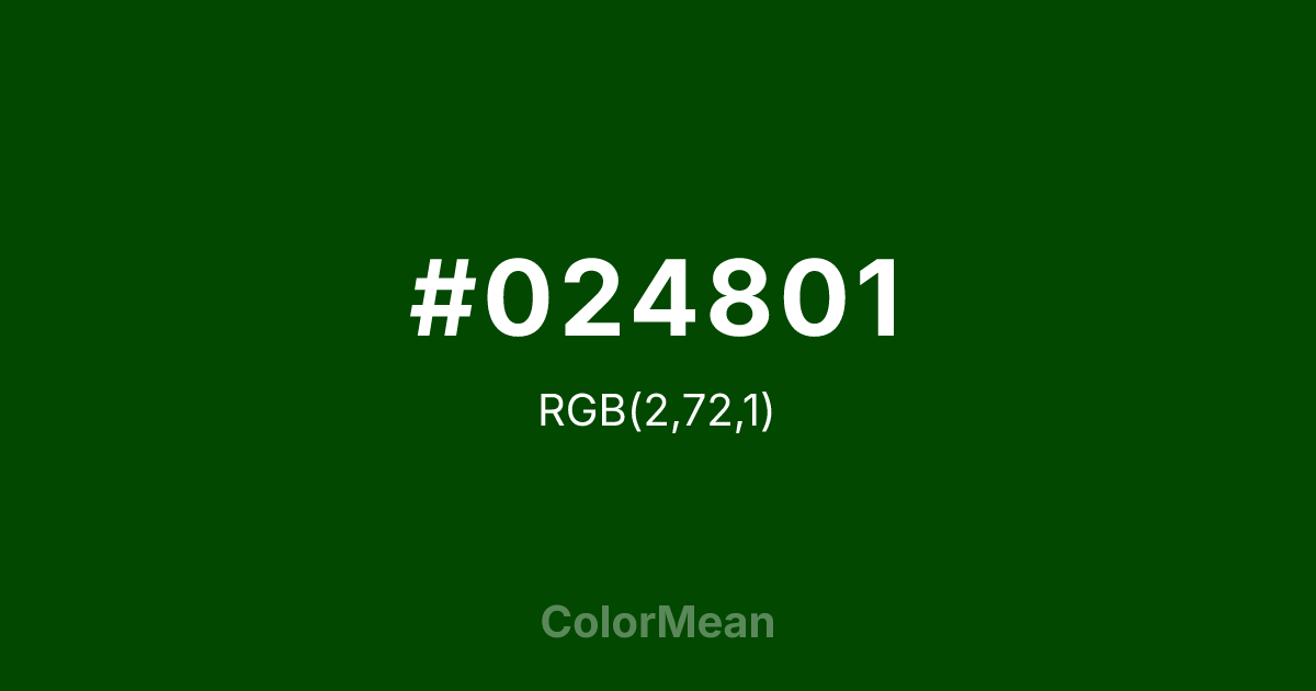 #024801 RGB value is (2, 72, 1). The hex color red value is 2, green is 72, and blue is 1. Its HSL format shows a hue of 119°, saturation of 97 percent, and lightness of 14 percent. The CMYK process values are 97 percent, 0 percent, 99 percent, 72 percent.