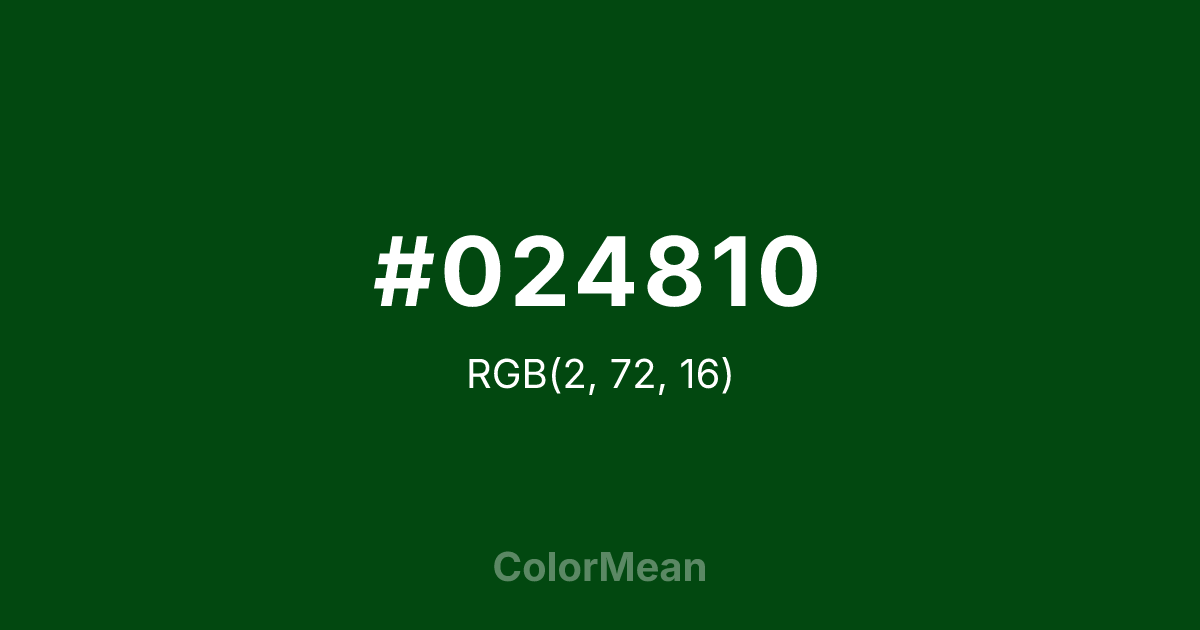 #024810 RGB value is (2, 72, 16). The hex color red value is 2, green is 72, and blue is 16. Its HSL format shows a hue of 132°, saturation of 95 percent, and lightness of 15 percent. The CMYK process values are 97 percent, 0 percent, 78 percent, 72 percent.