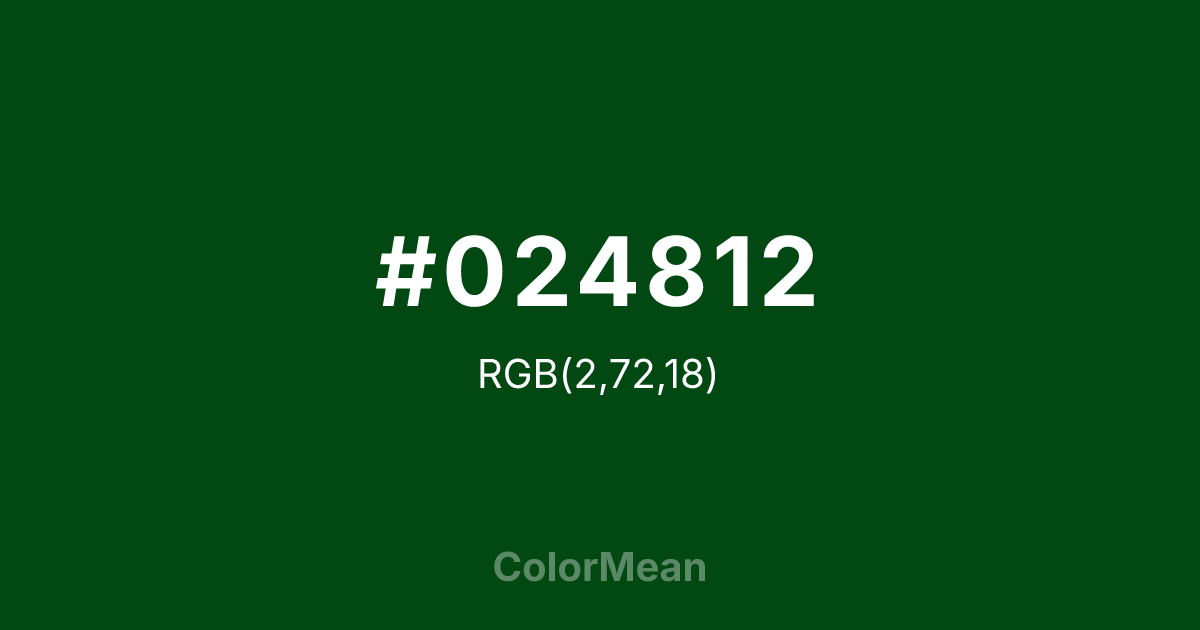 #024812 RGB value is (2, 72, 18). The hex color red value is 2, green is 72, and blue is 18. Its HSL format shows a hue of 134°, saturation of 95 percent, and lightness of 15 percent. The CMYK process values are 97 percent, 0 percent, 75 percent, 72 percent.