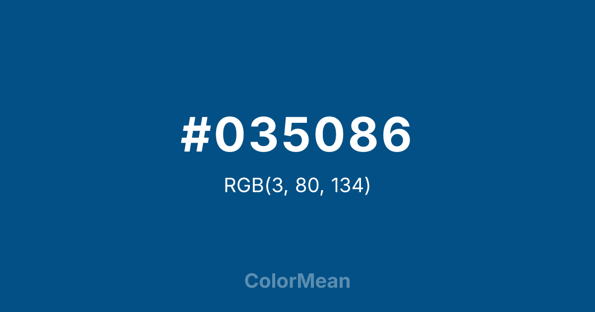 #035086 RGB value is (3, 80, 134). The hex color red value is 3, green is 80, and blue is 134. Its HSL format shows a hue of 205°, saturation of 96 percent, and lightness of 27 percent. The CMYK process values are 98 percent, 40 percent, 0 percent, 47 percent.