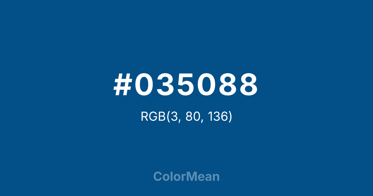 #035088 RGB value is (3, 80, 136). The hex color red value is 3, green is 80, and blue is 136. Its HSL format shows a hue of 205°, saturation of 96 percent, and lightness of 27 percent. The CMYK process values are 98 percent, 41 percent, 0 percent, 47 percent.