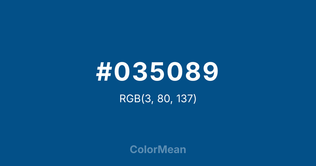 #035089 RGB value is (3, 80, 137). The hex color red value is 3, green is 80, and blue is 137. Its HSL format shows a hue of 206°, saturation of 96 percent, and lightness of 27 percent. The CMYK process values are 98 percent, 42 percent, 0 percent, 46 percent.