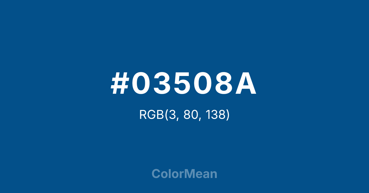 #03508A RGB value is (3, 80, 138). The hex color red value is 3, green is 80, and blue is 138. Its HSL format shows a hue of 206°, saturation of 96 percent, and lightness of 28 percent. The CMYK process values are 98 percent, 42 percent, 0 percent, 46 percent.