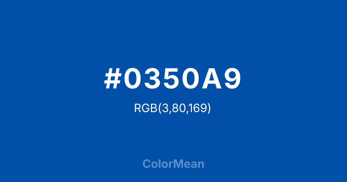 #0350A9 RGB value is (3, 80, 169). The hex color red value is 3, green is 80, and blue is 169. Its HSL format shows a hue of 212°, saturation of 97 percent, and lightness of 34 percent. The CMYK process values are 98 percent, 53 percent, 0 percent, 34 percent.