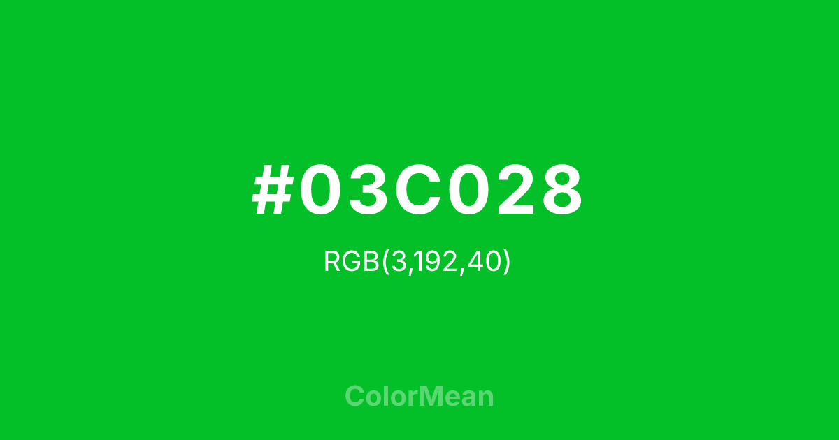 #03C028 RGB value is (3, 192, 40). The hex color red value is 3, green is 192, and blue is 40. Its HSL format shows a hue of 132°, saturation of 97 percent, and lightness of 38 percent. The CMYK process values are 98 percent, 0 percent, 79 percent, 25 percent.