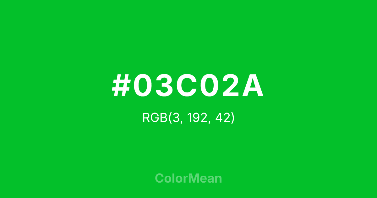 #03C02A RGB value is (3, 192, 42). The hex color red value is 3, green is 192, and blue is 42. Its HSL format shows a hue of 132°, saturation of 97 percent, and lightness of 38 percent. The CMYK process values are 98 percent, 0 percent, 78 percent, 25 percent.