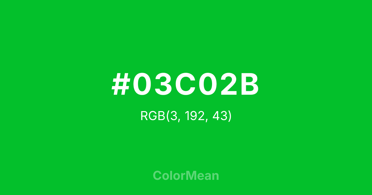 #03C02B RGB value is (3, 192, 43). The hex color red value is 3, green is 192, and blue is 43. Its HSL format shows a hue of 133°, saturation of 97 percent, and lightness of 38 percent. The CMYK process values are 98 percent, 0 percent, 78 percent, 25 percent.