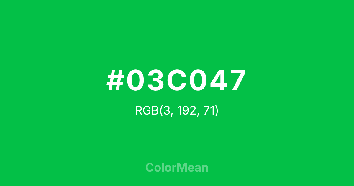 #03C047 RGB value is (3, 192, 71). The hex color red value is 3, green is 192, and blue is 71. Its HSL format shows a hue of 142°, saturation of 97 percent, and lightness of 38 percent. The CMYK process values are 98 percent, 0 percent, 63 percent, 25 percent.