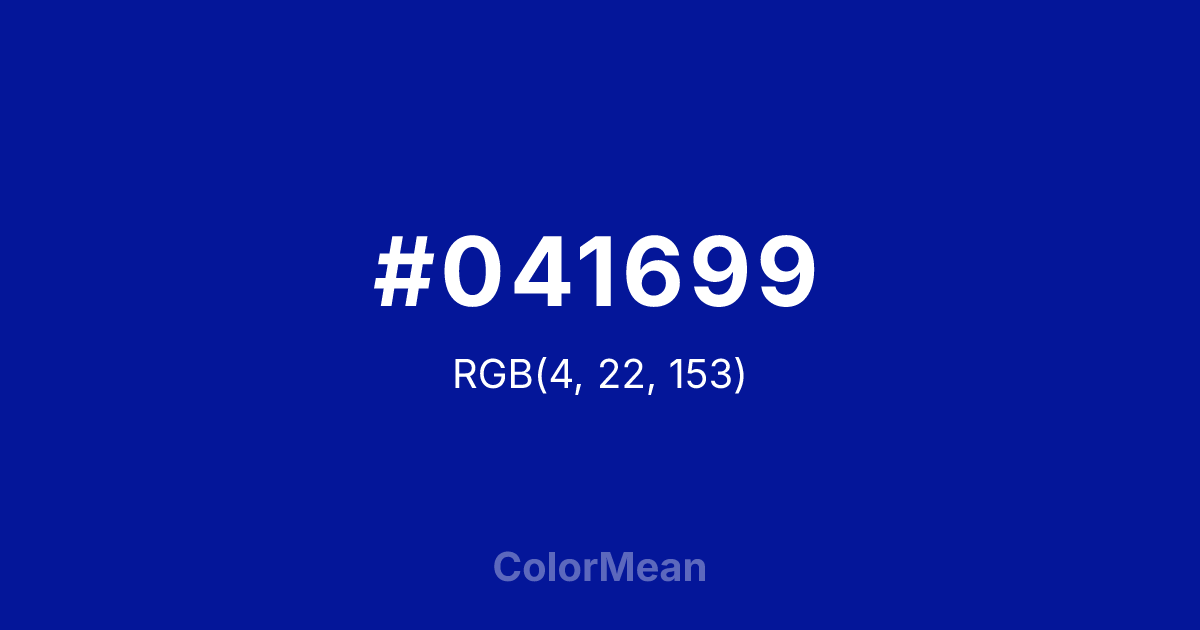 #041699 RGB value is (4, 22, 153). The hex color red value is 4, green is 22, and blue is 153. Its HSL format shows a hue of 233°, saturation of 95 percent, and lightness of 31 percent. The CMYK process values are 97 percent, 86 percent, 0 percent, 40 percent.