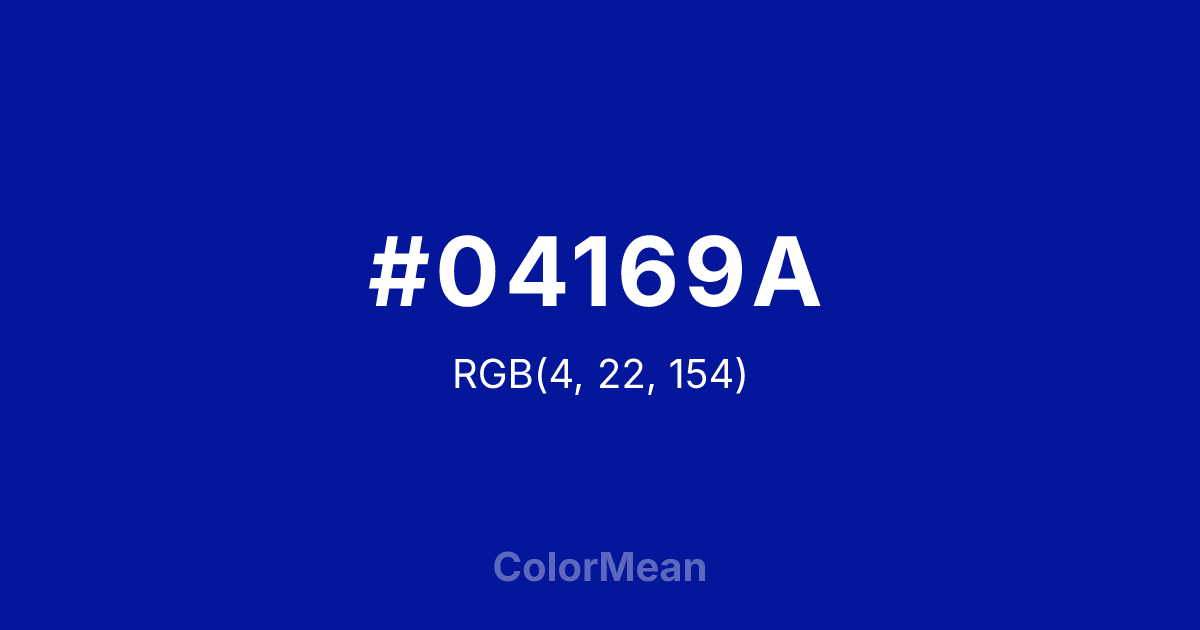 #04169A RGB value is (4, 22, 154). The hex color red value is 4, green is 22, and blue is 154. Its HSL format shows a hue of 233°, saturation of 95 percent, and lightness of 31 percent. The CMYK process values are 97 percent, 86 percent, 0 percent, 40 percent.